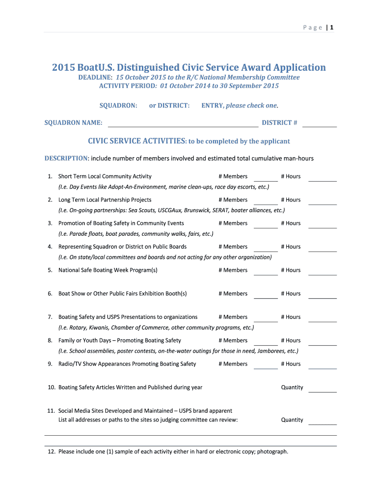 P a g e 1 2015 Boat. S. Distinguished Civic Service Award Application DEADLINE:15 October 2015 to the R/C National Membership Committee ACTIVITY PERIOD: 01 October 2014 to 30 September 2015 SQUADRON: