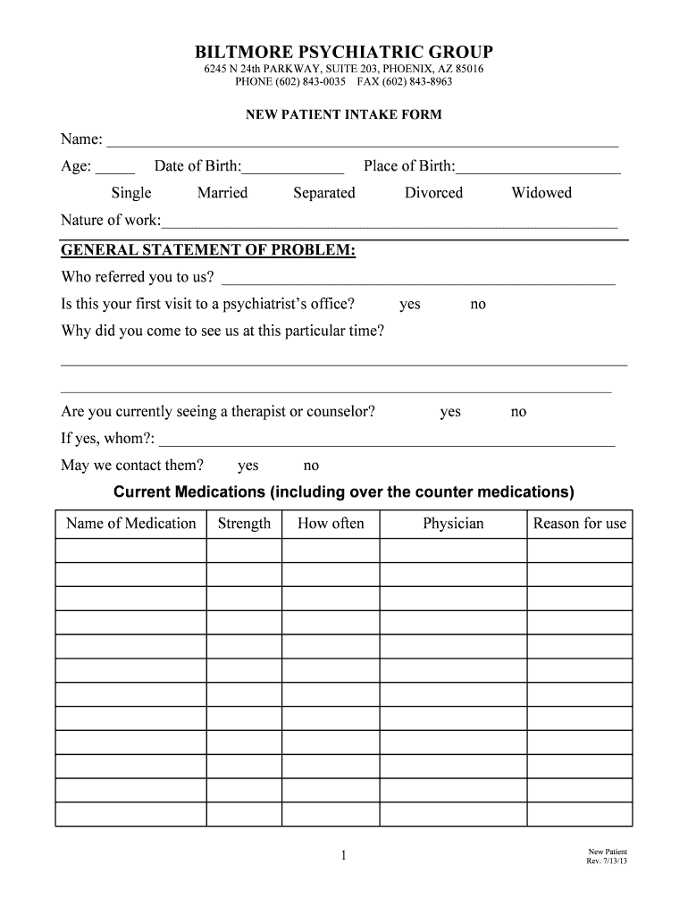 BILTMORE PSYCHIATRIC GROUP 6245 N 24th PARKWAY, SUITE 203, PHOENIX, AZ 85016 PHONE (602) 8430035 FAX (602) 8438963 NEW PATIENT INTAKE FORM Name: Age: Date of Birth: Single Married Place of Birth: