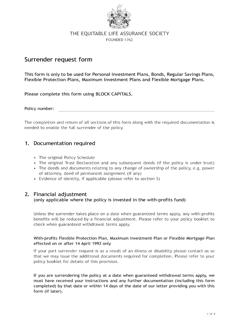 THE EQUITABLE LIFE ASSURANCE SOCIETY FOUNDED 1762 Surrender request from This form is only to be used for Personal Investment Plans, Bonds, Regular Savings Plans, Flexible Protection Plans, Maximum