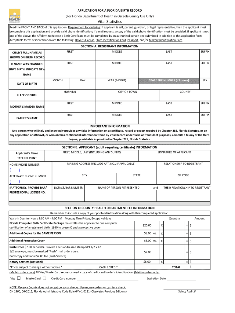 APPLICATION FOR A FLORIDA BIRTH RECORD (For Florida Department of Health in Osceola County Use Only) Vital Statistics Read the FRONT AND BACK of this application: Requirement for ordering: If applicant