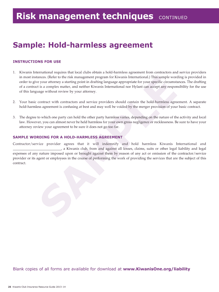 Risk management techniques CONTINUED Sample: Hold harmless agreement INSTRUCTIONS FOR USE LE 1. Kiwanis International requires that local clubs obtain a hold harmless agreement from contractors and