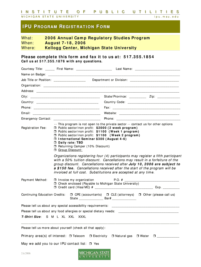 II N S T II T U T E N S T T U T E O F O F P U B L II C P U B L C U T II L II T II E S U T L T E S MICHIGAN STATE UNIVERSITY CPU.MSU.edu HIP U P R O G R A M R E G IIS T R A T RIO N F O R M PU PROGRAM