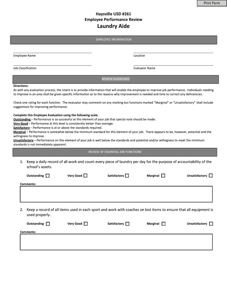 This document serves as a performance evaluation for the Laundry Aide position, outlining job functions, guidelines for evaluation, and providing a space for comments from both evaluators and employees.