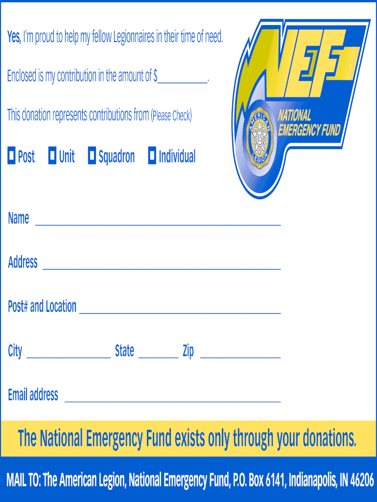 Yes, I'm proud to help my fellow Legionnaires in their time of need. Enclosed is my contribution in the amount of $. This donation represents contributions from (Please Check) Post Unit Squadron Individual