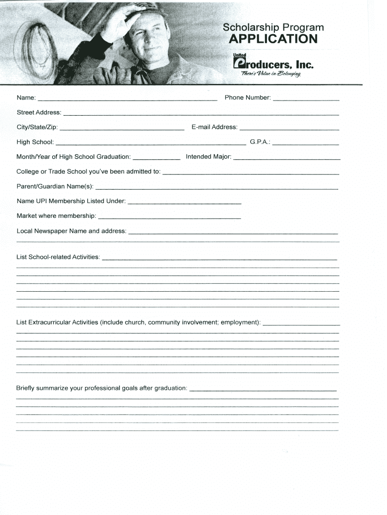 Scholarship Program APPLICATION United 'producers, Inc. “7 “MM4 Name: Phone Number: t, e 5tMltji '!f. StreetAddress: City/State/Zip: Email Address: G.P.A.: High School: Monthly ear of High School