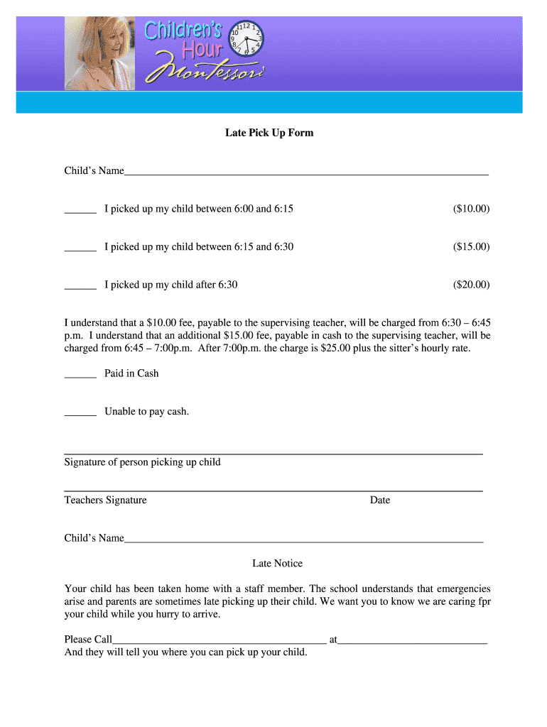 Late Pick Up Form Child's Name I picked up my child between 6:00 and 6:15 ($10.00) I picked up my child between 6:15 and 6:30 ($15.00) I picked up my child after 6:30 ($20.00) I understand that a