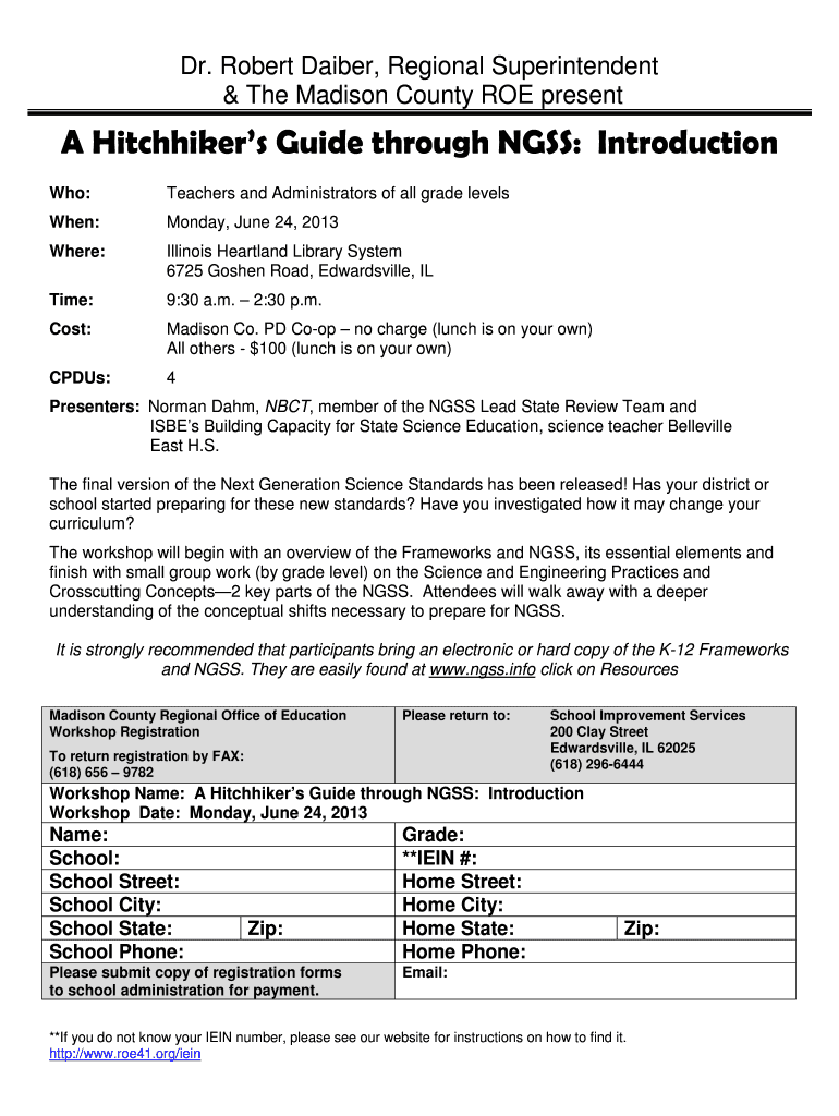 Dr. Robert Dauber, Regional Superintendent & The Madison County ROE present A Hitchhiker's Guide through GNSS: Introduction Who: Teachers and Administrators of all grade levels When: Monday, June