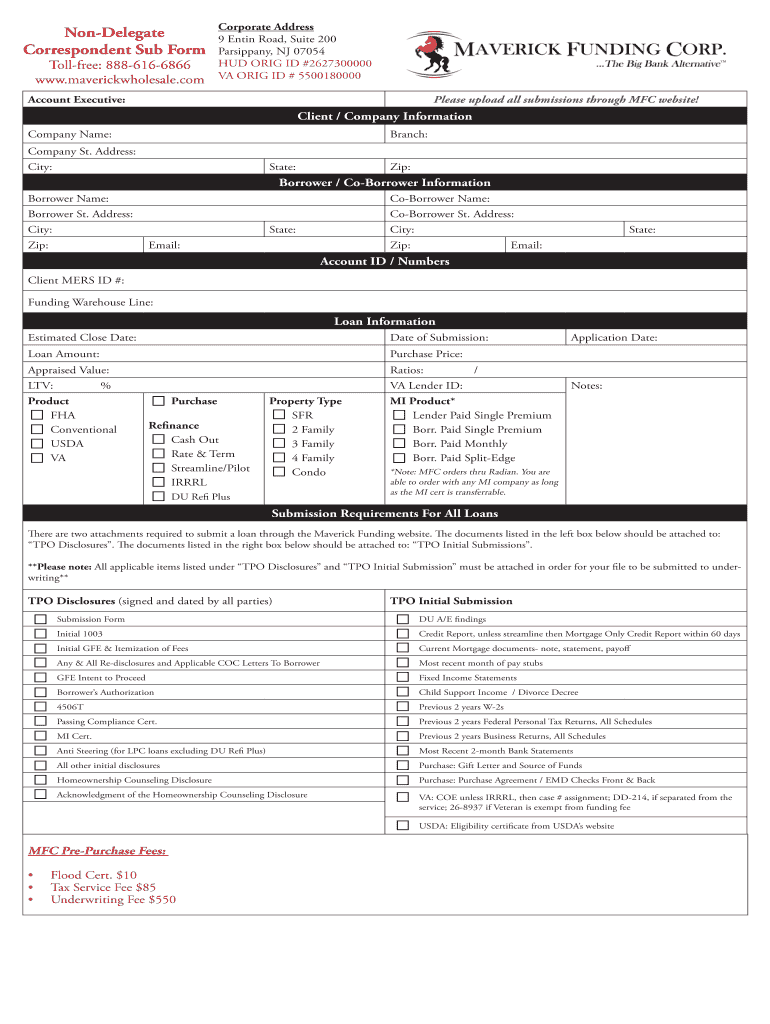 Delegate Correspondent Sub Form Toll free: 8886166866 www.maverickwholesale.com Corporate Address 9 Dentin Road, Suite 200 Parsimony, NJ 07054 HUD ORIG ID #2627300000 VA ORIG ID # 5500180000 Account