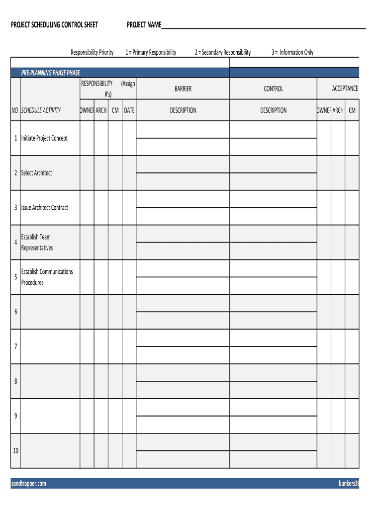 PROJECT SCHEDULING CONTROL SHEET PROJECT NAME Responsibility Priority 1 Primary Responsibility 2 Secondary Responsibility 3 Information Only PREPLANNING PHASE RESPONSIBILITY # is) NO. SCHEDULE ACTIVITY