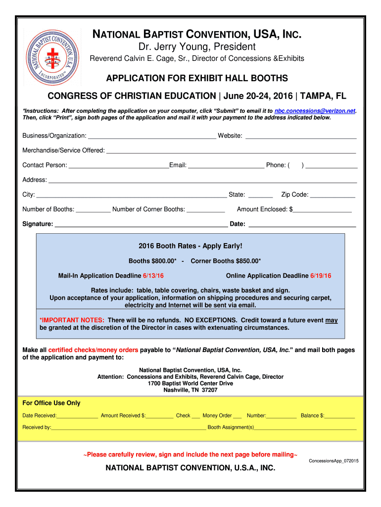 NATIONAL BAPTIST CONVENTION, USA, INC. Dr. Jerry Young, President Reverend Calvin E. Cage, Sr., Director of Concessions exhibits APPLICATION FOR EXHIBIT HALL BOOTHS F CONGRESS OF CHRISTIAN EDUCATION