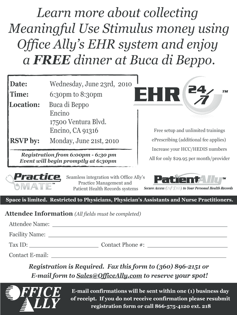 An invitation to learn about collecting Meaningful Use Stimulus money using Office Ally’s EHR system, including event details and registration information.