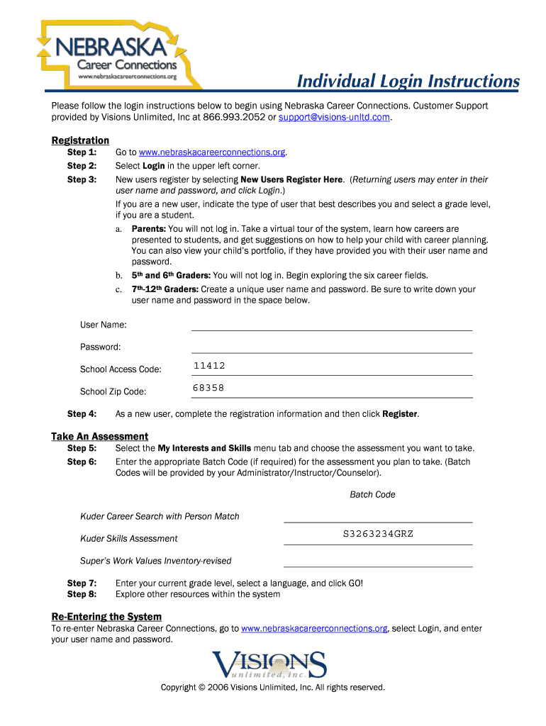 Individual Login Instructions Please follow the login instructions below to begin using Nebraska Career Connections. Customer Support provided by Visions Unlimited, Inc at 866.993.2052 or support