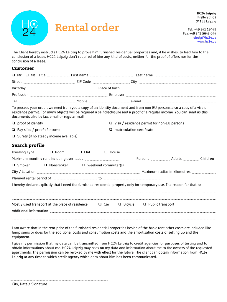 HC24 Leipzig Prellerstr. 62 04155 Leipzig Rental order Tel.: +49 341 19445 Fax: +49 341 5643 044 Leipzig hc24.de www.hc24.de The Client hereby instructs HC24 Leipzig to prove him furnished residential