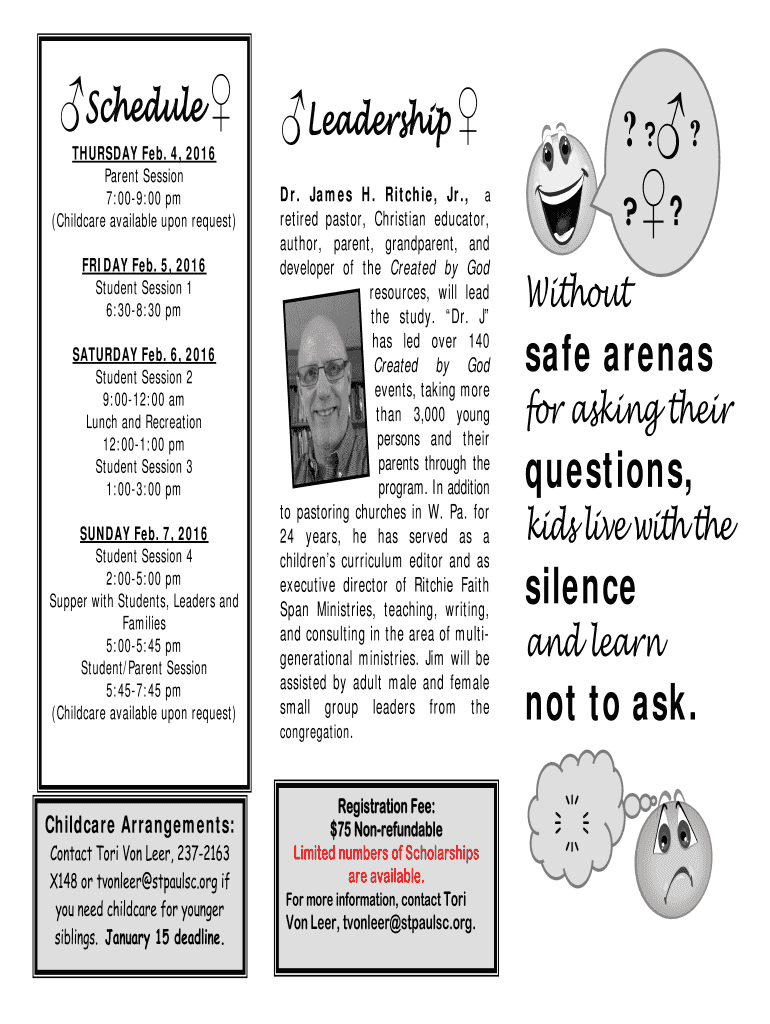 Schedule THURSDAY Feb. 4, 2016 Parent Session 7:009:00 pm (Childcare available upon request) FRIDAY Feb. 5, 2016 Student Session 1 6:308:30 pm SATURDAY Feb. 6, 2016 Student Session 2 9:0012:00 am