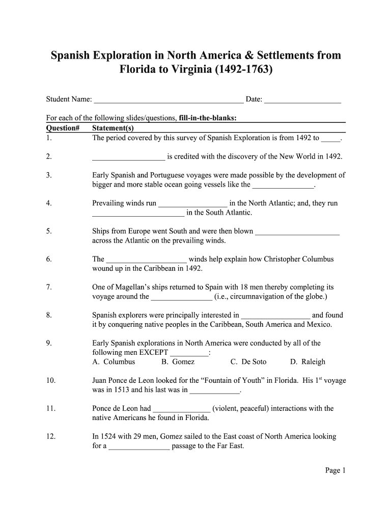Spanish Exploration in North America & Settlements from Florida to Virginia (14921763) Student Name: Date: For each of the following slides/questions, fillintheblanks: Question# Statement(s) 1. The