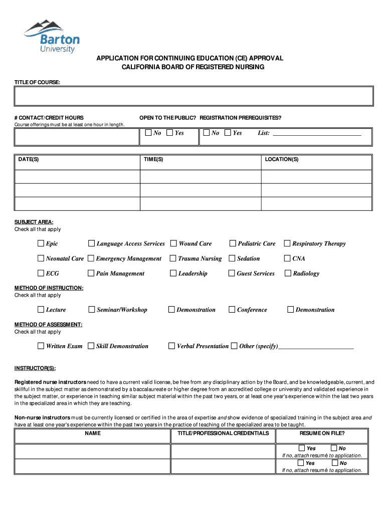 Get the free APPLICATION FOR CONTINUING EDUCATION CE APPROVAL - education bartonhealth