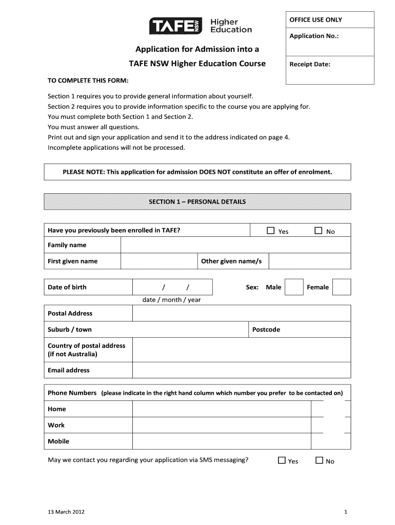 Get the free Application for Admission into a TAFE NSW Higher Education