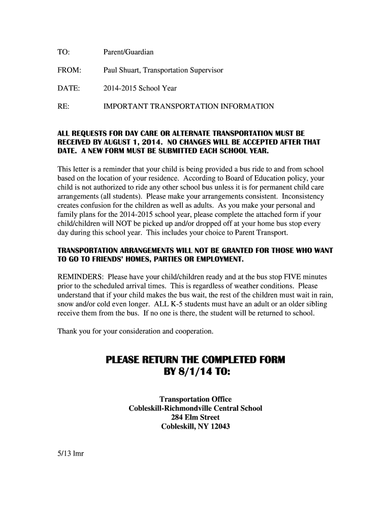 TO: Parent/Guardian FROM: Paul Stuart, Transportation Supervisor DATE: 20142015 School Year RE: IMPORTANT TRANSPORTATION INFORMATION ALL REQUESTS FOR DAY CARE OR ALTERNATE TRANSPORTATION MUST BE RECEIVED