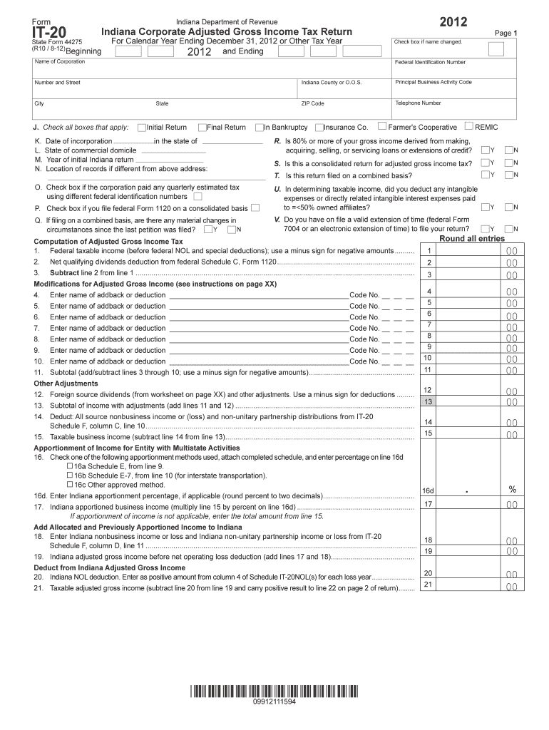 Form IT2044275 State Form (R10 / 812) Beginning Name of Corporation Number and Street 2012 Indiana Department of Revenue Indiana Corporate Adjusted Gross Income Tax Return For Calendar Year Ending