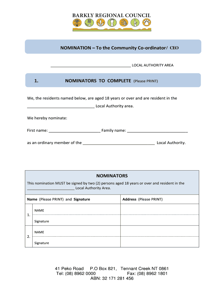 Get the free NOMINATION To the Community Coordinator - barkly nt gov
