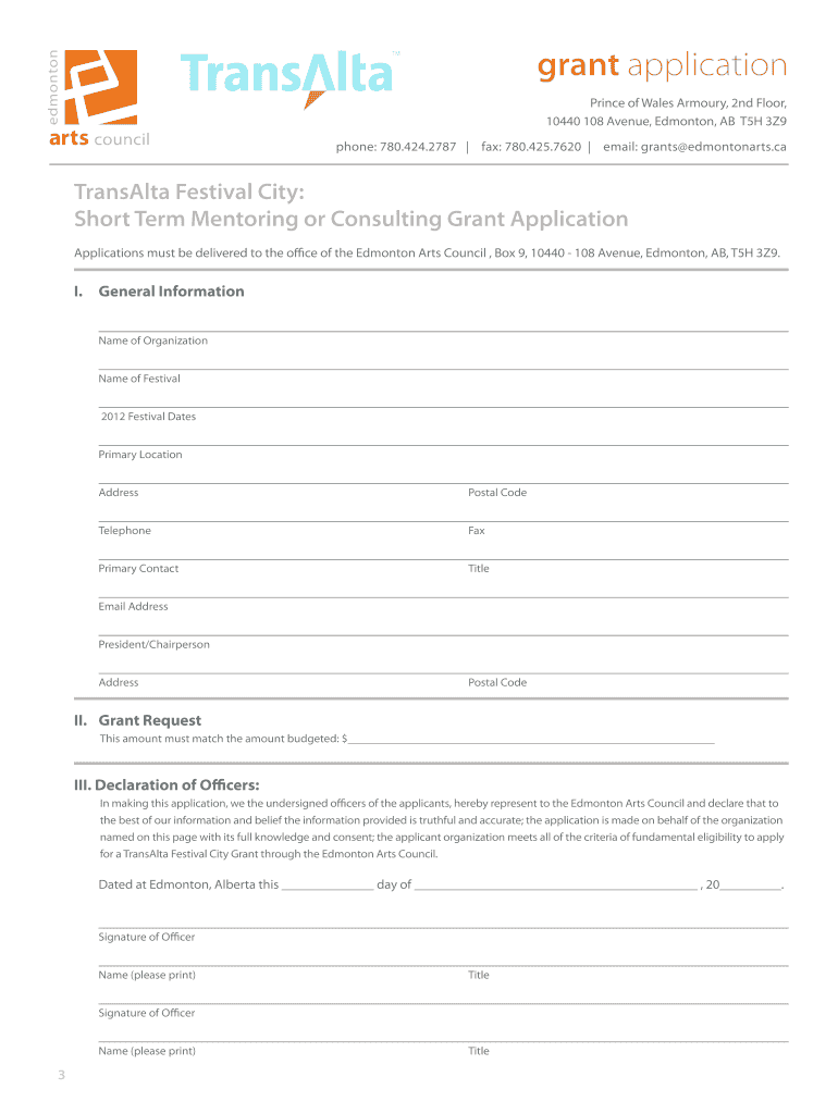 Grant application Prince of Wales Armory, 2nd Floor, 10440 108 Avenue, Edmonton, AB T5H 3Z9 phone: 780.424.2787 fax: 780.425.7620 email: grants edmontonarts.ca TransAlta Festival City: Short Term
