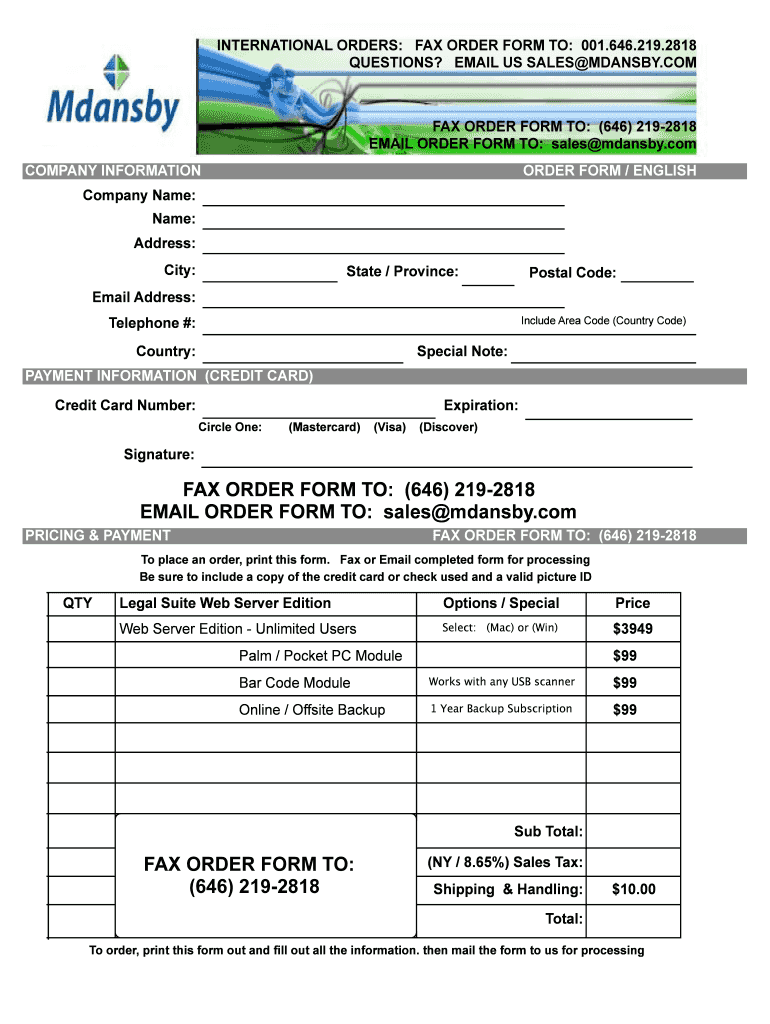 INTERNATIONAL ORDERS: FAX ORDER FORM TO: 001.646.219.2818 QUESTIONS? EMAIL US SALES MDANSBY.COM FAX ORDER FORM TO: (646) 219-2818 EMAIL ORDER FORM TO: sales mdansby.com COMPANY INFORMATION ORDER FORM