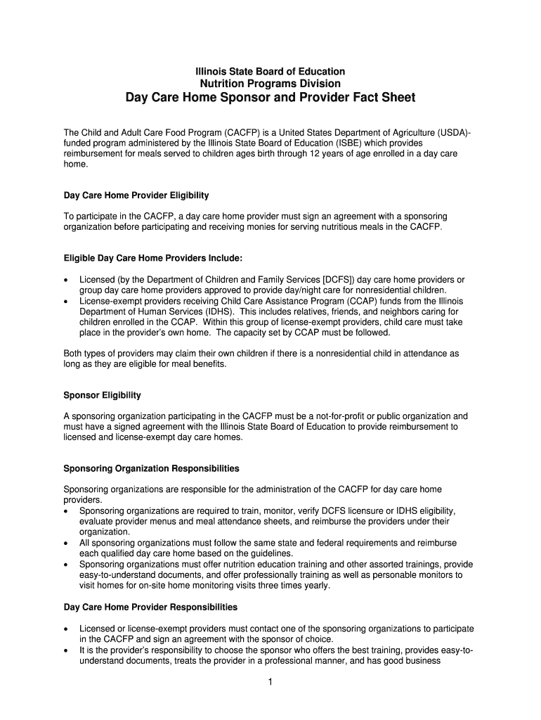 Illinois State Board of EducationNutrition Programs Division Day Care Home Sponsor and Provider Fact Sheet