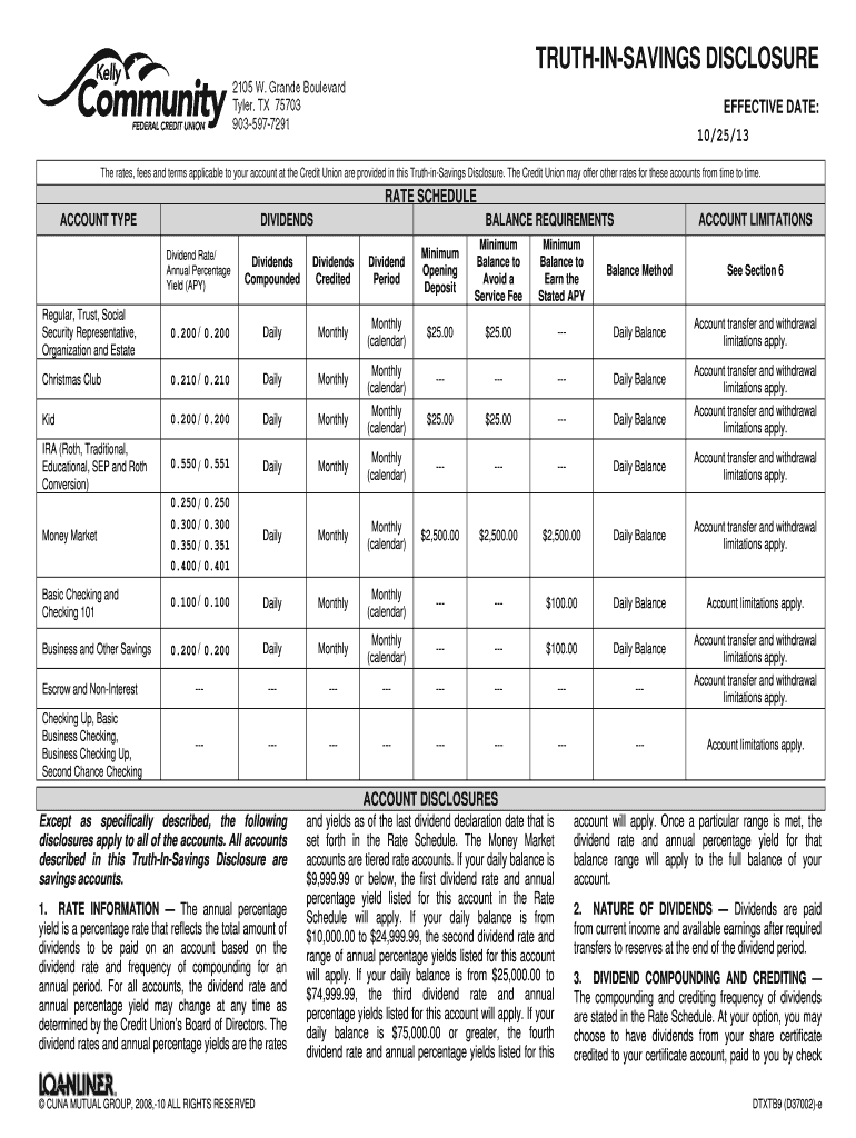 TRUTHINSAVINGS DISCLOSURE EFFECTIVE DATE: 10/25/13 The rates, fees and terms applicable to your account at the Credit Union are provided in this TruthinSavings Disclosure. The Credit Union may offer