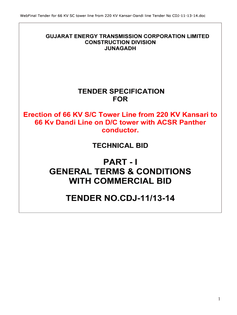 Webinar Tender for 66 KV SC tower line from 220 KV KansarDandi line Tender No CDJ111314.doc GUJARAT ENERGY TRANSMISSION CORPORATION LIMITED CONSTRUCTION DIVISION JUNAGADH TENDER SPECIFICATION FOR