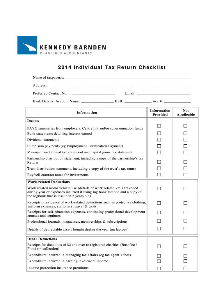 2 0 1 4 I n d i v i d u an l T an × R e t urn C h e c k l i s t Name of taxpayer/s: Address: Preferred Contact No: Email: Bank Details: Account Name: BSB: Account #: Information Income PAY summaries