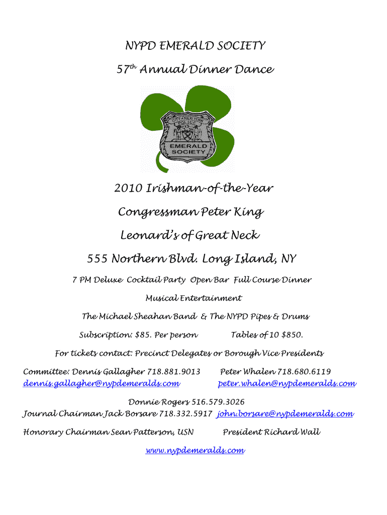 NYPD EMERALD SOCIETY 57th Annual Dinner Dance 2010 IrishmanoftheYear Congressman Peter King Leonard's of Great Neck 555 Northern Blvd. Long Island, NY 7 PM Deluxe Cocktail Party Open Bar Full-Course