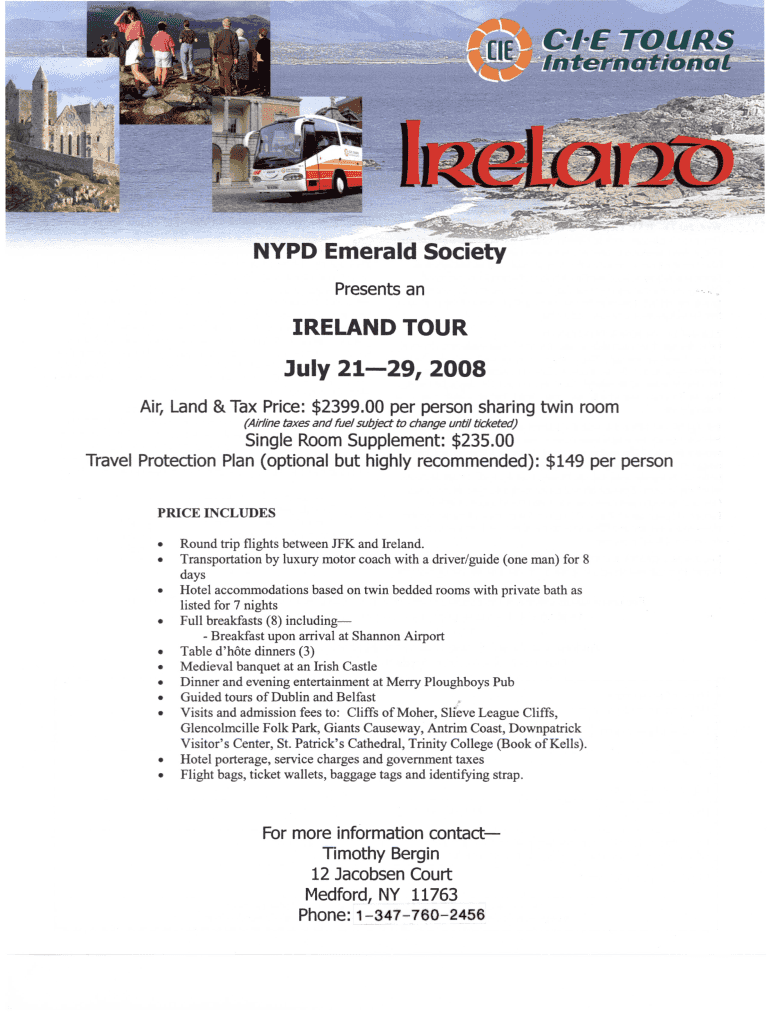 NYPD Emerald Society Presents an IRELAND TOUR July 2129, 2008 Air, Land & Tax Price: $2399.00 per person sharing twin room (Airline taxes and fuel subject to change until ticketed) Single Room Supplement: