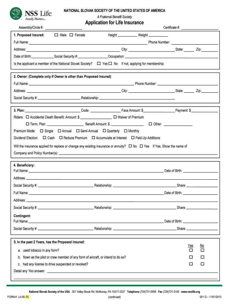 NATIONAL SLOVAK SOCIETY OF THE UNITED STATES OF AMERICA A Fraternal Benefit Society Application for Life Insurance Assembly/Circle #: Certificate #: Male 1. Proposed Insured: Female Height Weight
