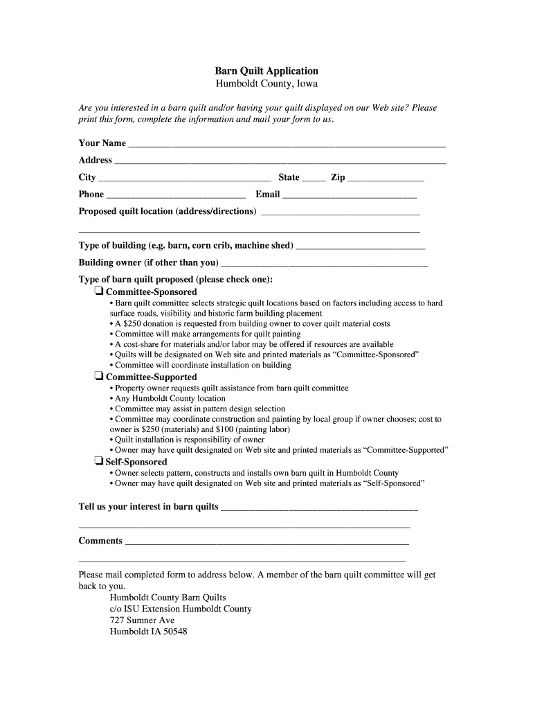 Barn Quilt Application Humboldt County, Iowa Are you interested in a barn quilt and/or having your quilt displayed on our Website? Please print this form, complete the information and mail your form