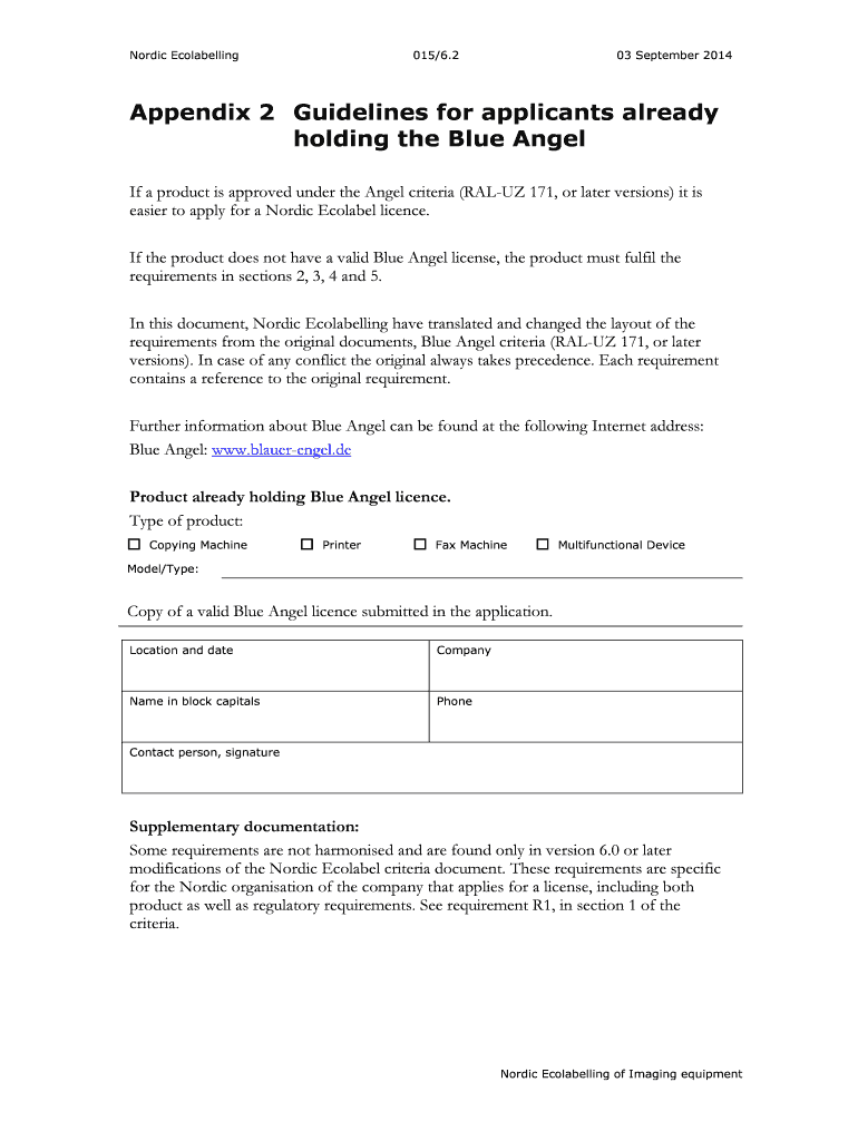 Nordic Eco labelling 015/6.2 03 September 2014 Appendix 2 Guidelines for applicants already holding the Blue Angel If a product is approved under the Angel criteria (VALUE 171, or later versions)