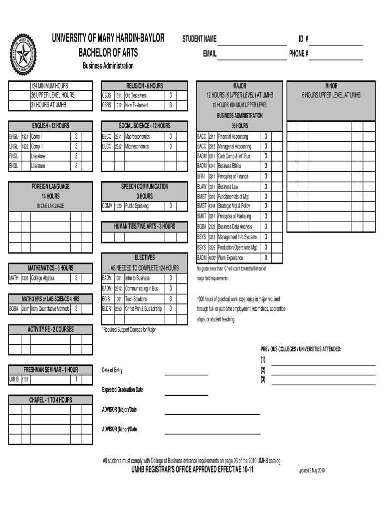 UNIVERSITY OF MARY HARDINBAYLOR BACHELOR OF ARTS STUDENT NAME EMAIL Business Administration 124 MINIMUM HOURS 36 UPPER LEVEL HOURS 31 HOURS AT BMHB CSS ENGLISH 12 HOURS EGL 1321 Comp I EGL 1322 Comp