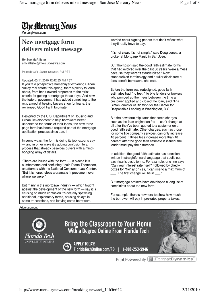 New mortgage form delivers mixed message San Jose Mercury News New mortgage form delivers mixed message By Sue McAllister mercurynews.com Posted: 03/11/2010 12:42:34 PM PST Updated: 03/11/2010 12:42:35