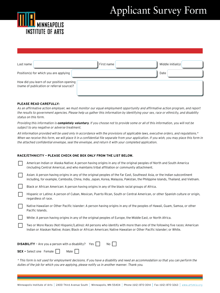 Applicant Survey Form Last name First name Middle initial(s) Position(s) for which you are applying Date How did you learn of our position opening (name of publication or referral source)? Please