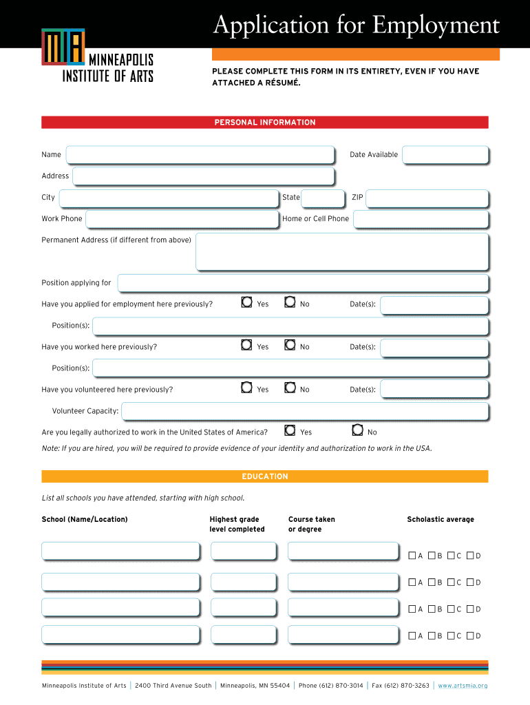 Application for Employment Please complete this form In Its entirety, even If you Have attached a sum. Personal Information Name Date Available Address City State Work Phone ZIP Home or Cell Phone
