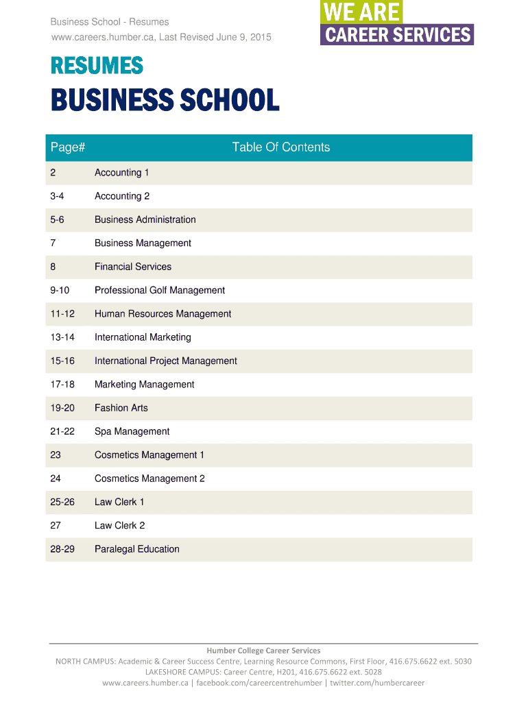 Business School Resumes www.careers.humber.ca, Last Revised June 9, 2015RESUMESBUSINESS SCHOOL Page#Table Of Contents2Accounting 134Accounting 256Business Administration7Business Management8Financial