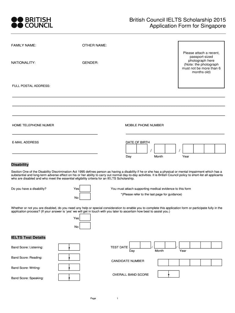 British Council IELTS Scholarship 2015 Application Form for Singapore FAMILY NAME: OTHER NAME: NATIONALITY: Please attach a recent, passport sized photograph here (Note: the photograph must not be