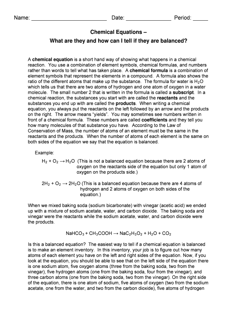 Name: Date: Period: Chemical Equations What are they, and how can I tell if they are balanced? A chemical equation is a shorthand way of showing what happens in a chemical reaction. You use a combination