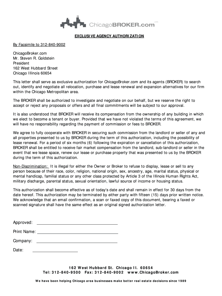 EXCLUSIVE AGENCY AUTHORIZATION By Facsimile to 3128409002 ChicagoBroker.com Mr. Steven R. Goldstein President 162 West Hubbard Street Chicago Illinois 60654 This letter shall serve as exclusive authorization
