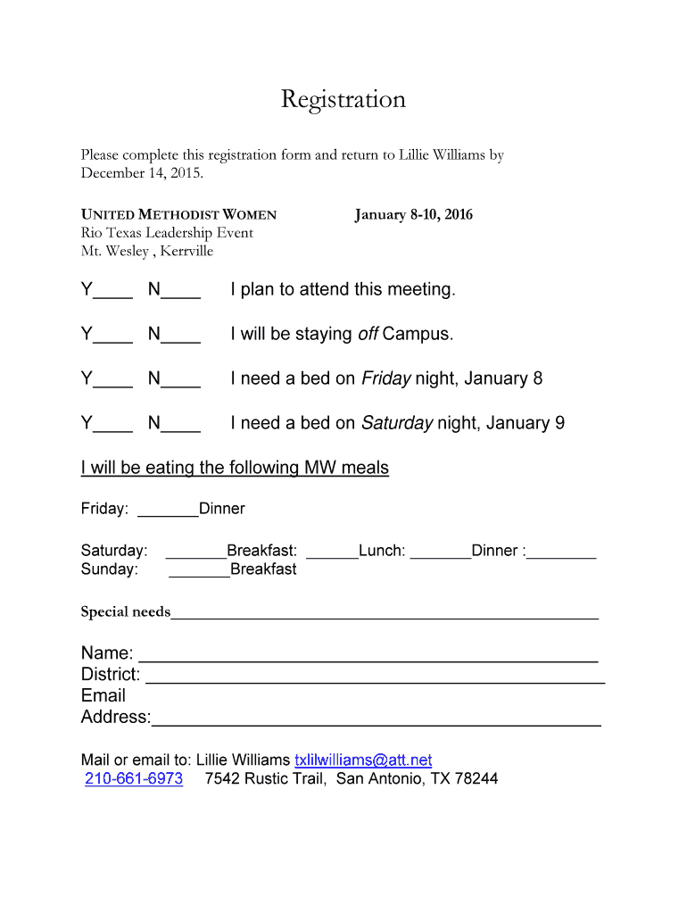 Registration Please complete this registration form and return to Lillie Williams by December 14, 2015. UNITED METHODIST WOMEN Rio Texas Leadership Event Mt. Wesley, Kerrville January 810, 2016 Y