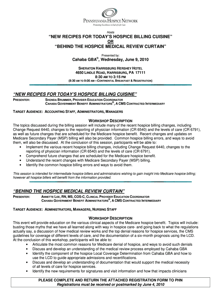 Hosts NEW RECIPES FOR TODAYS HOSPICE BILLING CUISINE OR BEHIND THE HOSPICE MEDICAL REVIEW CURTAIN Presented by: Casaba GBA, Wednesday, June 9, 2010, SHERATON HARRISBURG HERSHEY HOTEL 4650 KINDLE ROAD,