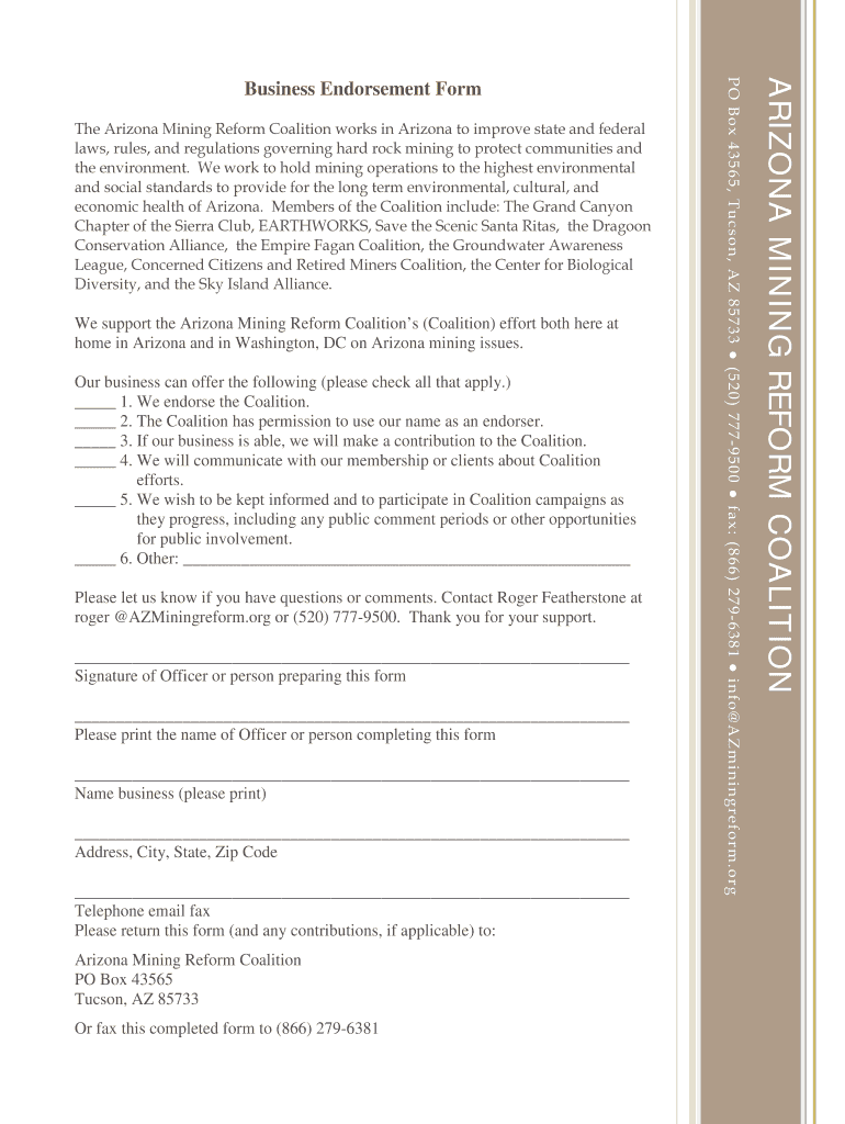 Get the free Business Endorsement Form - Arizona Mining Reform Coalition - azminingreform