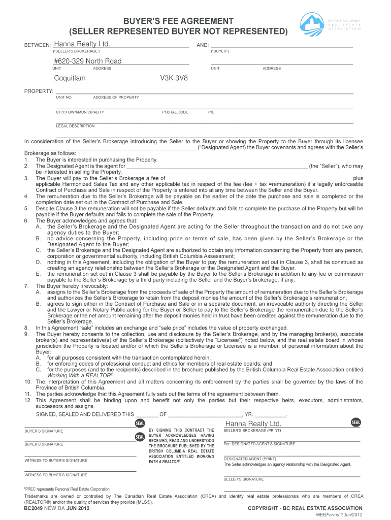 Save Clear Form Print Form 11 Save & Go To Form... Save & Go Home BUYERS FEE AGREEMENT (SELLER REPRESENTED BUYER NOT REPRESENTED) Helvetica Hanna Realty Ltd. BETWEEN: AND: (SELLERS BROKERAGE) (BUYER)