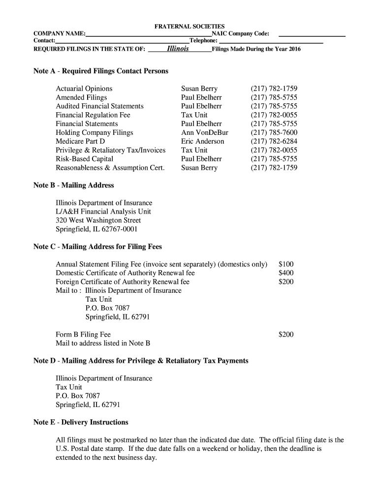 COMPANY NAME: Contact: REQUIRED FILINGS IN THE STATE OF:FRATERNAL SOCIETIES NAIL Company Code: Telephone: Illinois Filings Made During the Year 2016Note A Required Filings Contact Persons Actuarial