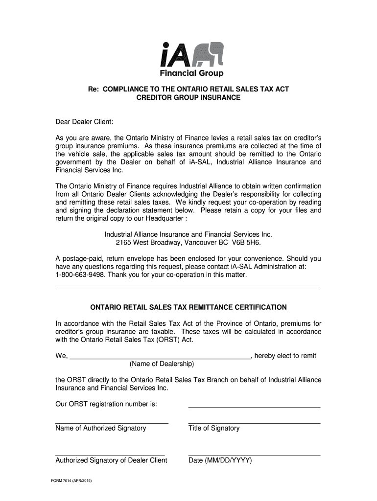 Re: COMPLIANCE TO THE ONTARIO RETAIL SALES TAX ACT CREDITOR GROUP INSURANCE Dear Dealer Client: As you are aware, the Ontario Ministry of Finance levies a retail sales tax on creditors group insurance