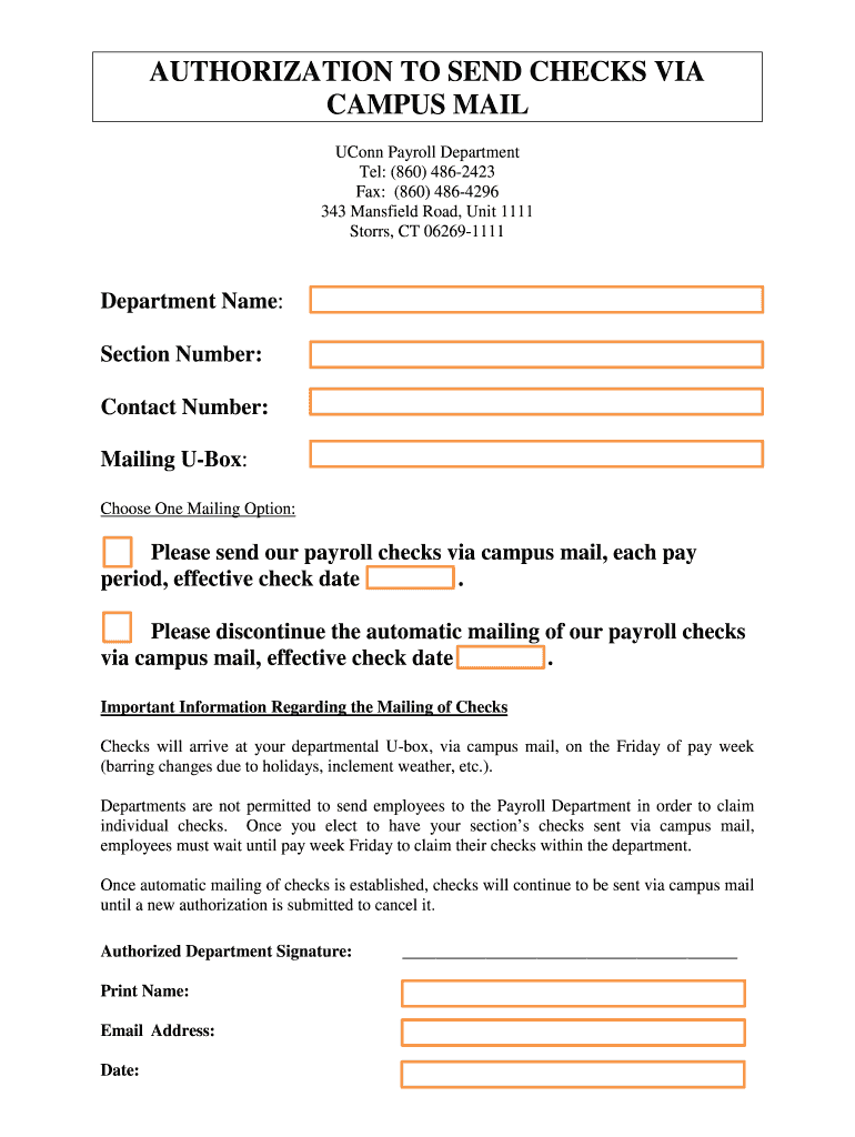 AUTHORIZATION TO SEND CHECKS VIA CAMPUS MAIL Conn Payroll Department Tel: (860 4862423 Fax: (860 4864296 343 Mansfield Road, Unit 1111 Stores, CT 062691111 Department Name: Section Number: Contact